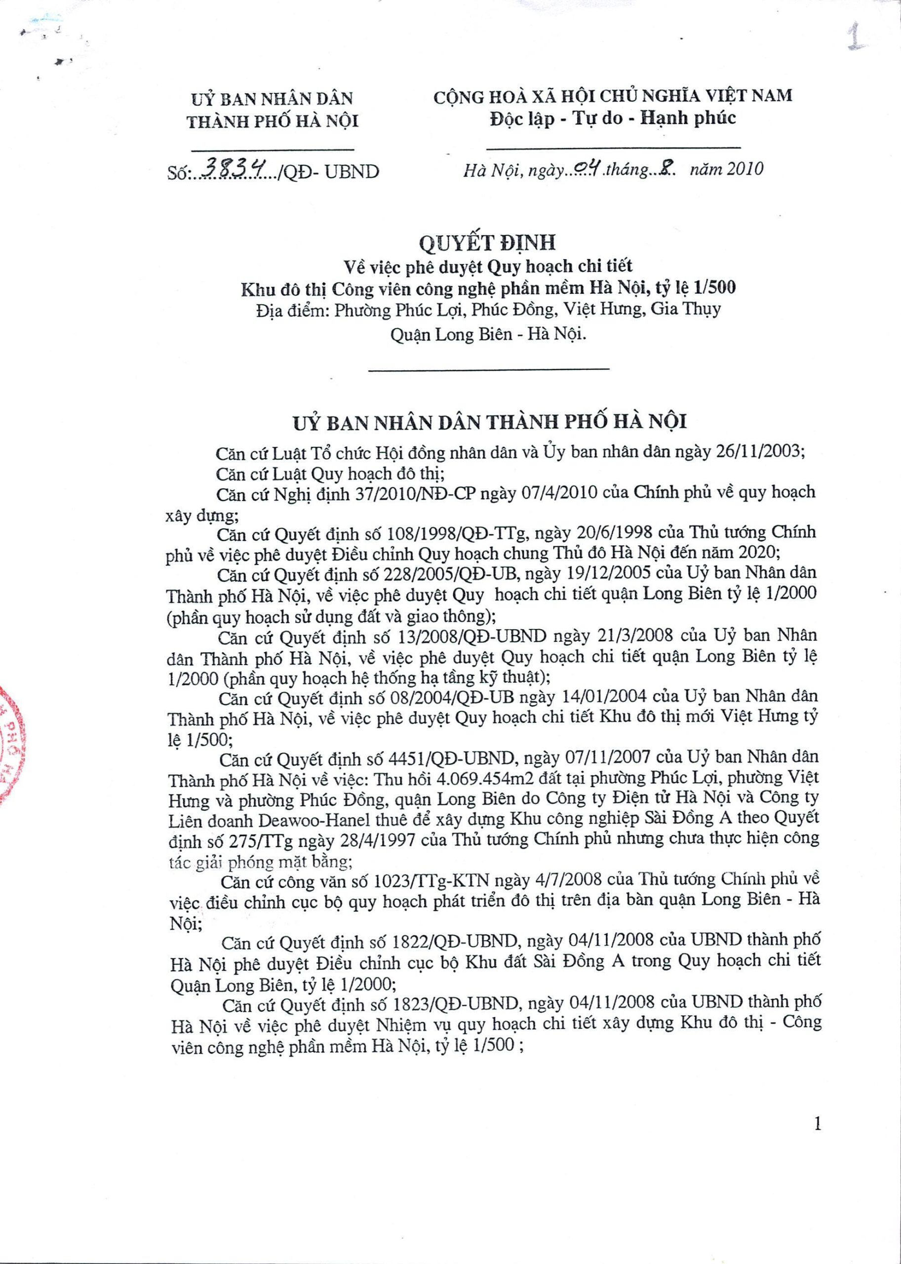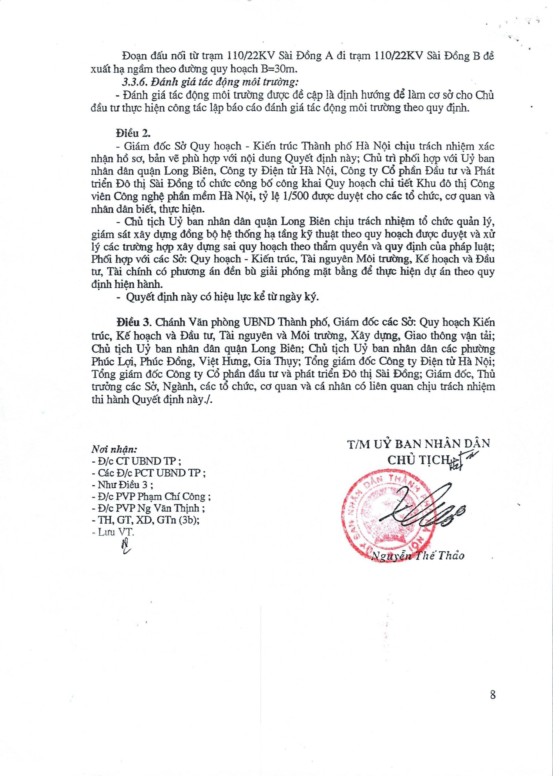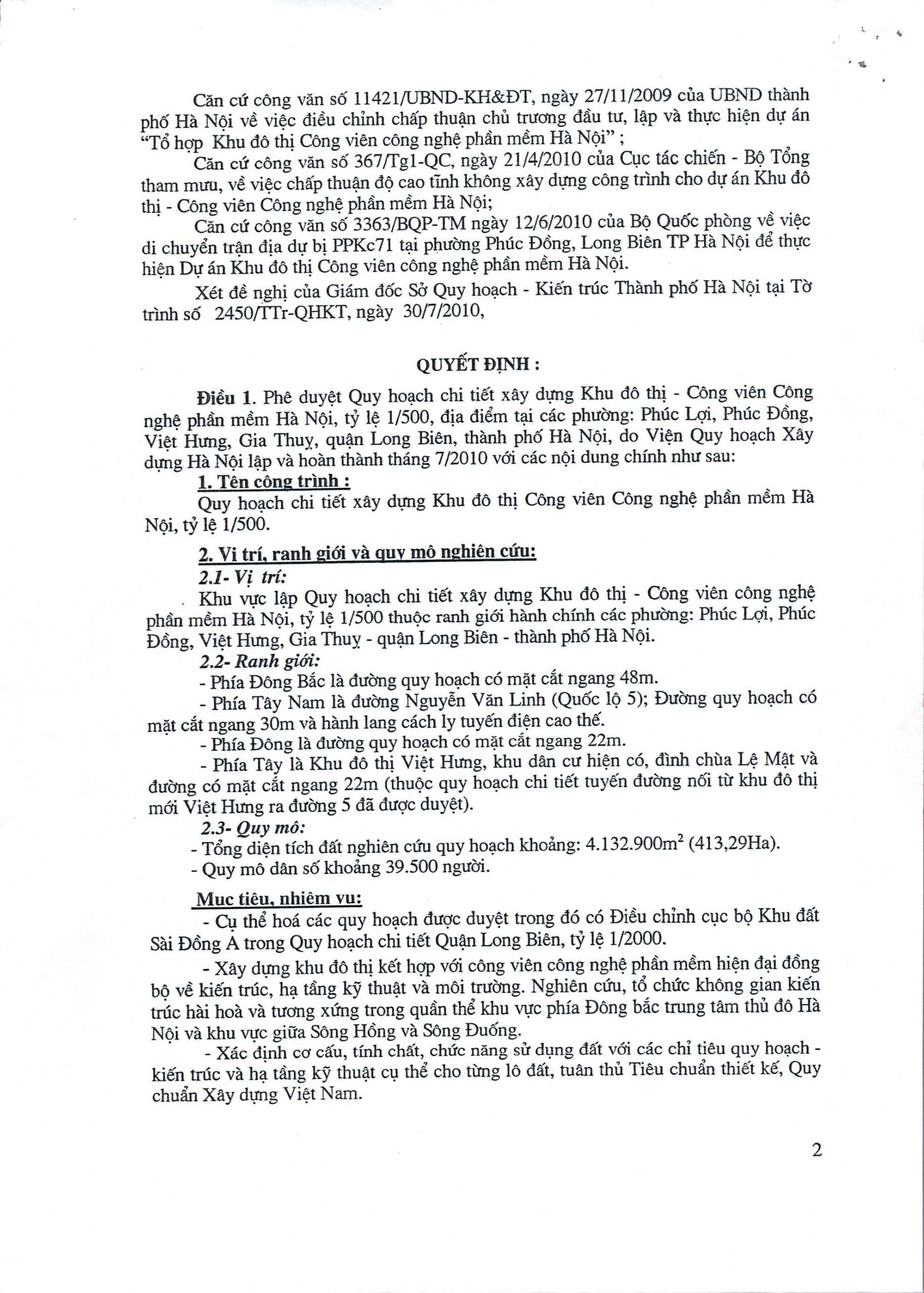 Quyết định về việc phê duyệt quy hoạch chi tiết Khu đô thị Công viên công nghệ phần mềm Hà Nội, tỷ lệ 1/500